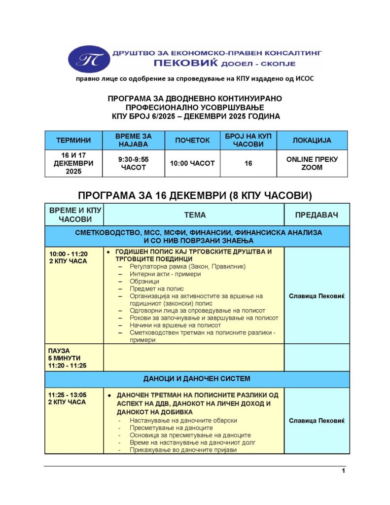Програма за дводневно континуирано усовршување КПУ 6/2025 декември 2025 година