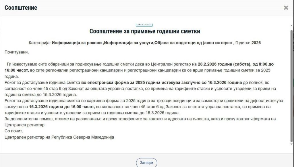 Сооштение од Централен регистар на РСМ – Рокови за поднесување на годишни сметки